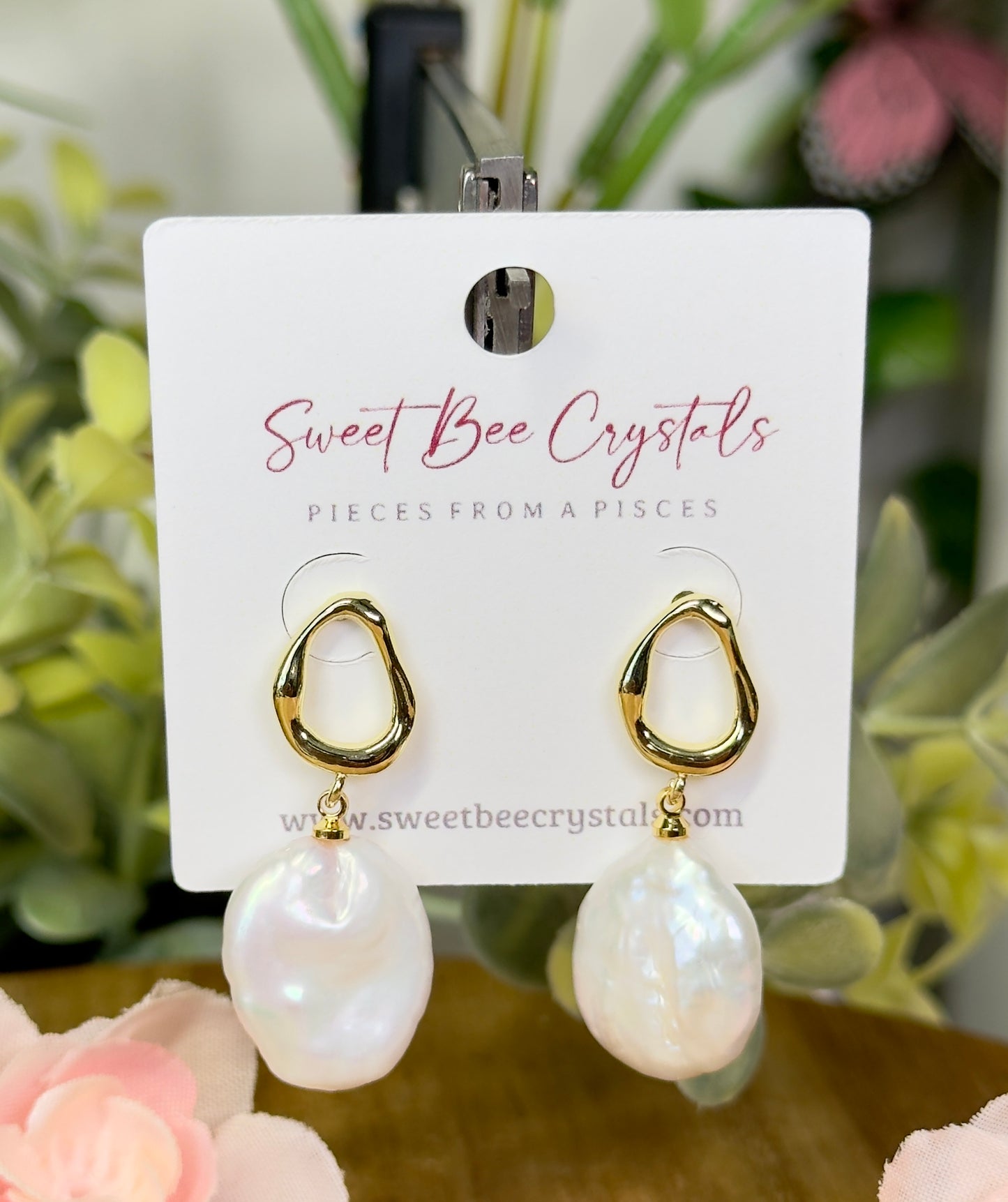 Baroque pearl drop earrings with silicon backs. 18k gold plated stainless steel